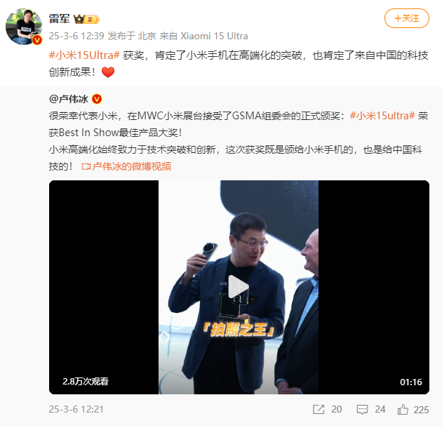 随后,雷军转发该博文并表示:“小米15 Ultra 获奖,肯定了小米手机在高端化的突破,也肯定了来自中国的科技创新成果!”